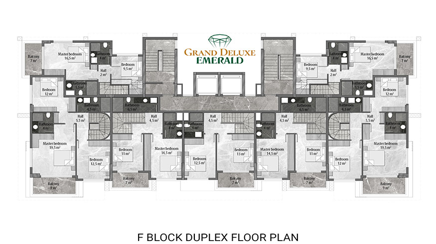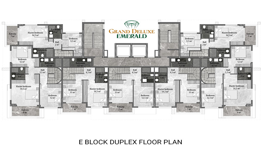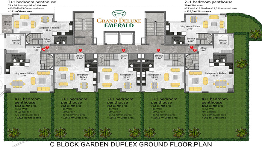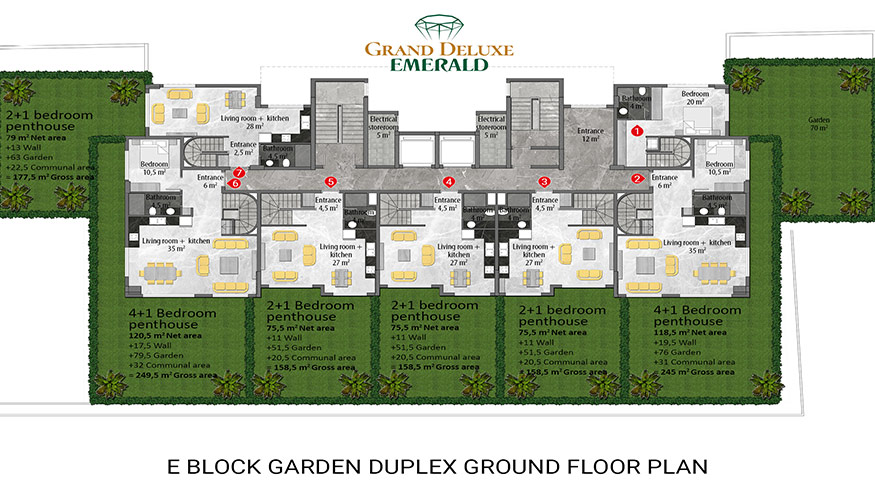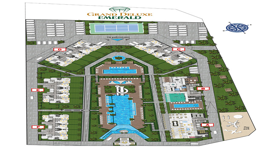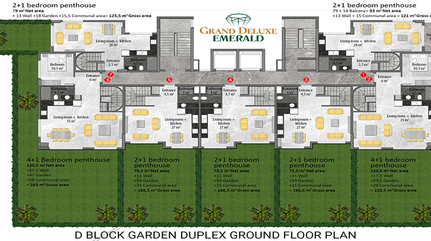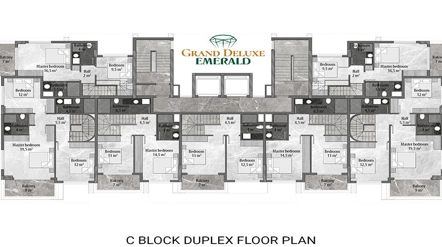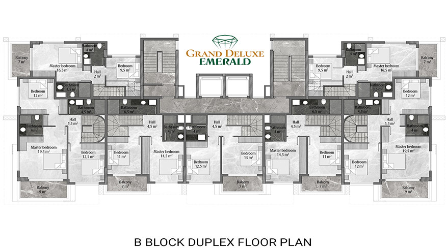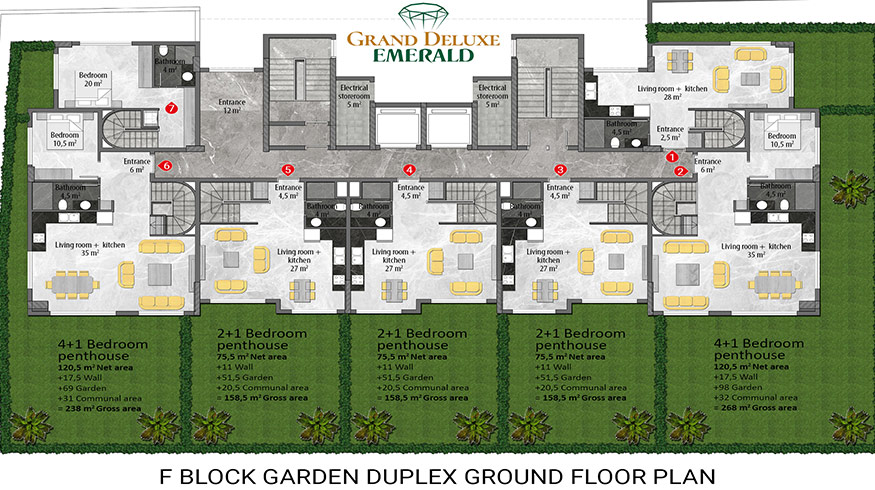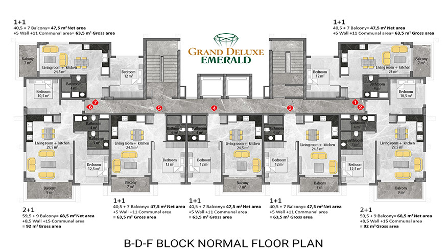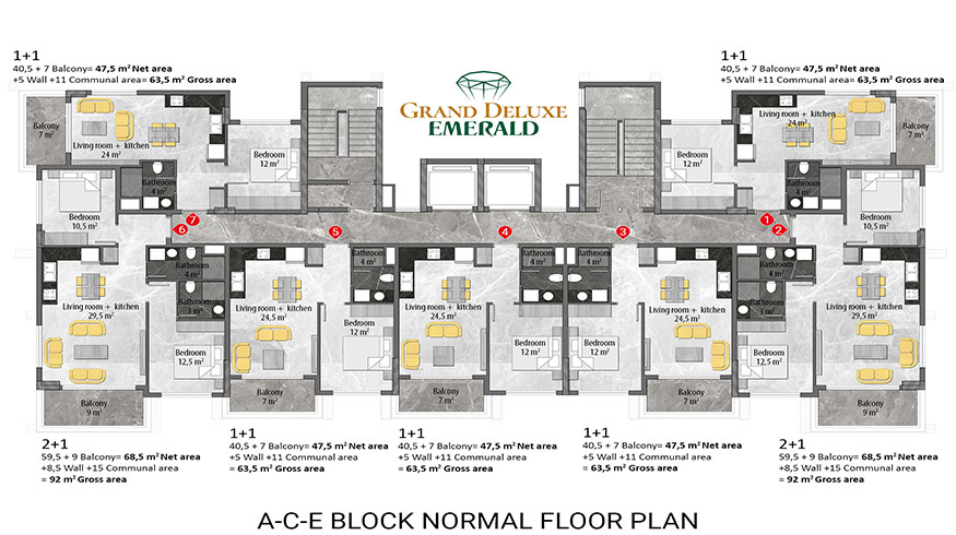 Emerald Grand Deluxe will be built on a 19,212 m2 plot and consists of 6 nine storey blocks. There will be a total of 378 apartments, 222 1-bedroom apartments, 88 2-bedroom apartments 42 penthouse apartments and for the first time in an Emerald project there will also be 26 garden duplex apartments, which each have a private garden, ranging in size from 51 m2 to 100 m2. Ensuring everyone can be a proud owner of an Emerald apartment with the high quality and comforts of Toroslar Emerald. Each apartment will come with fully fitted kitchens and bathrooms, air conditioning in each room and an instant water heater included.