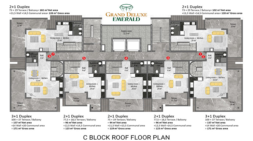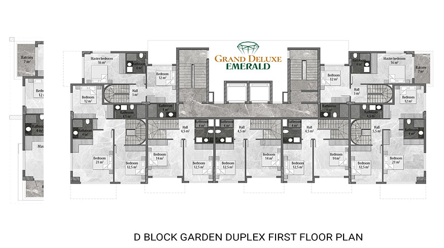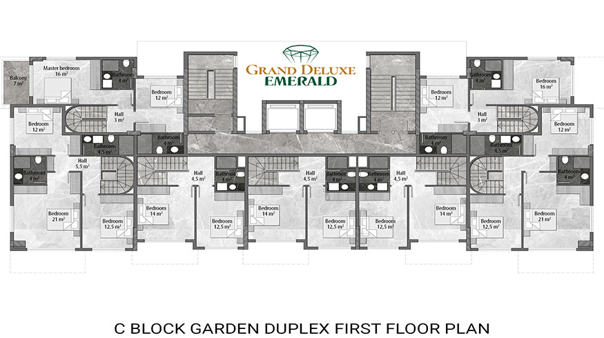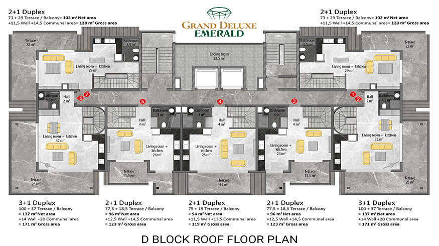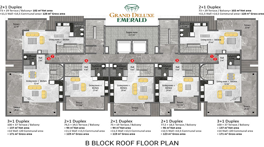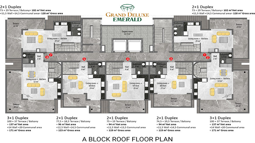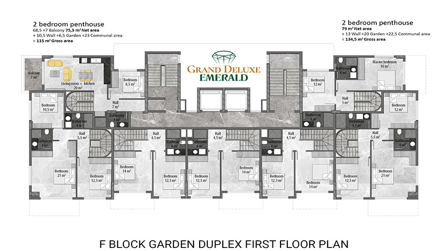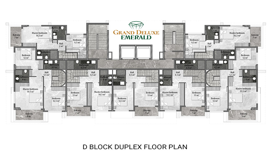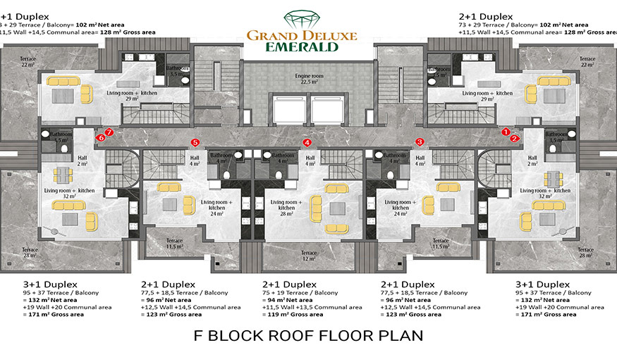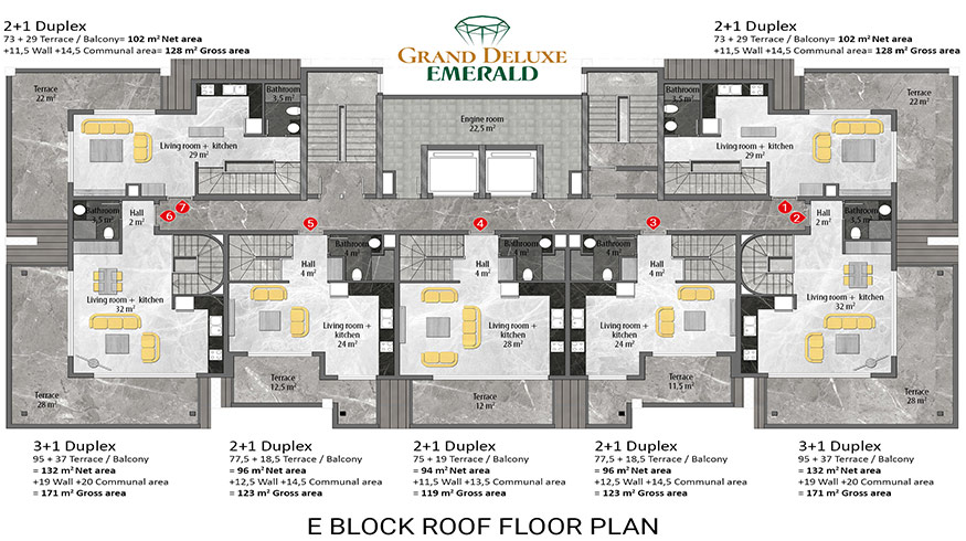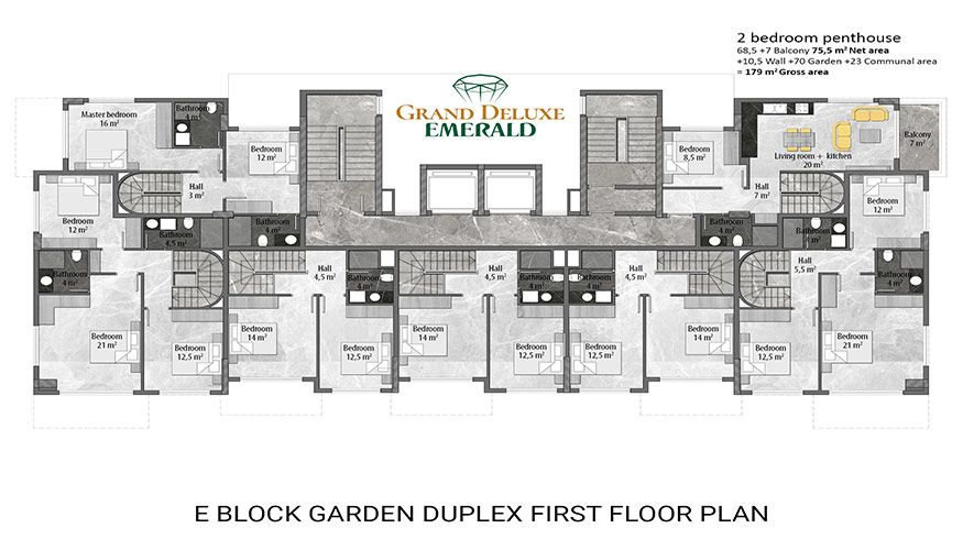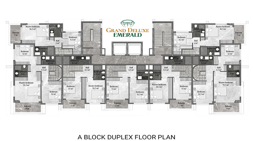 Emerald Grand Deluxe will be built on a 19,212 m2 plot and consists of 6 nine storey blocks. There will be a total of 378 apartments, 222 1-bedroom apartments, 88 2-bedroom apartments 42 penthouse apartments and for the first time in an Emerald project there will also be 26 garden duplex apartments, which each have a private garden, ranging in size from 51 m2 to 100 m2. Ensuring everyone can be a proud owner of an Emerald apartment with the high quality and comforts of Toroslar Emerald. Each apartment will come with fully fitted kitchens and bathrooms, air conditioning in each room and an instant water heater included.