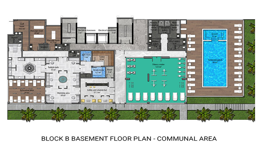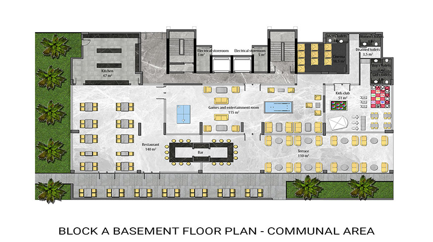 When designing our latest project, we aimed to provide a each of our clients with a home where they can get away from the stress of daily life and enjoy themselves. To enable this, we have included all the amenities of a 5-star hotel. These include large outdoor swimming pool with water slides (526 m2), a separate children’s swimming pool (41 m2), a relaxation swimming pool for adults (137 m2) and a heated indoor swimming pool (59 m2) as part of the luxury Spa centre. The Spa centre also has a Turkish bath, a sauna, a steam room, and massage rooms. Other amenities include a large professionally equipped gym, a kids club for our smaller residents, a cinema, and a games and entertainment room. We will also have a beautiful restaurant on-site. Outdoor amenities include large gardens, with a barbeque area, a great play park for children, and tennis and basketball courts. There will also be on-site parking as well as a parking garage.