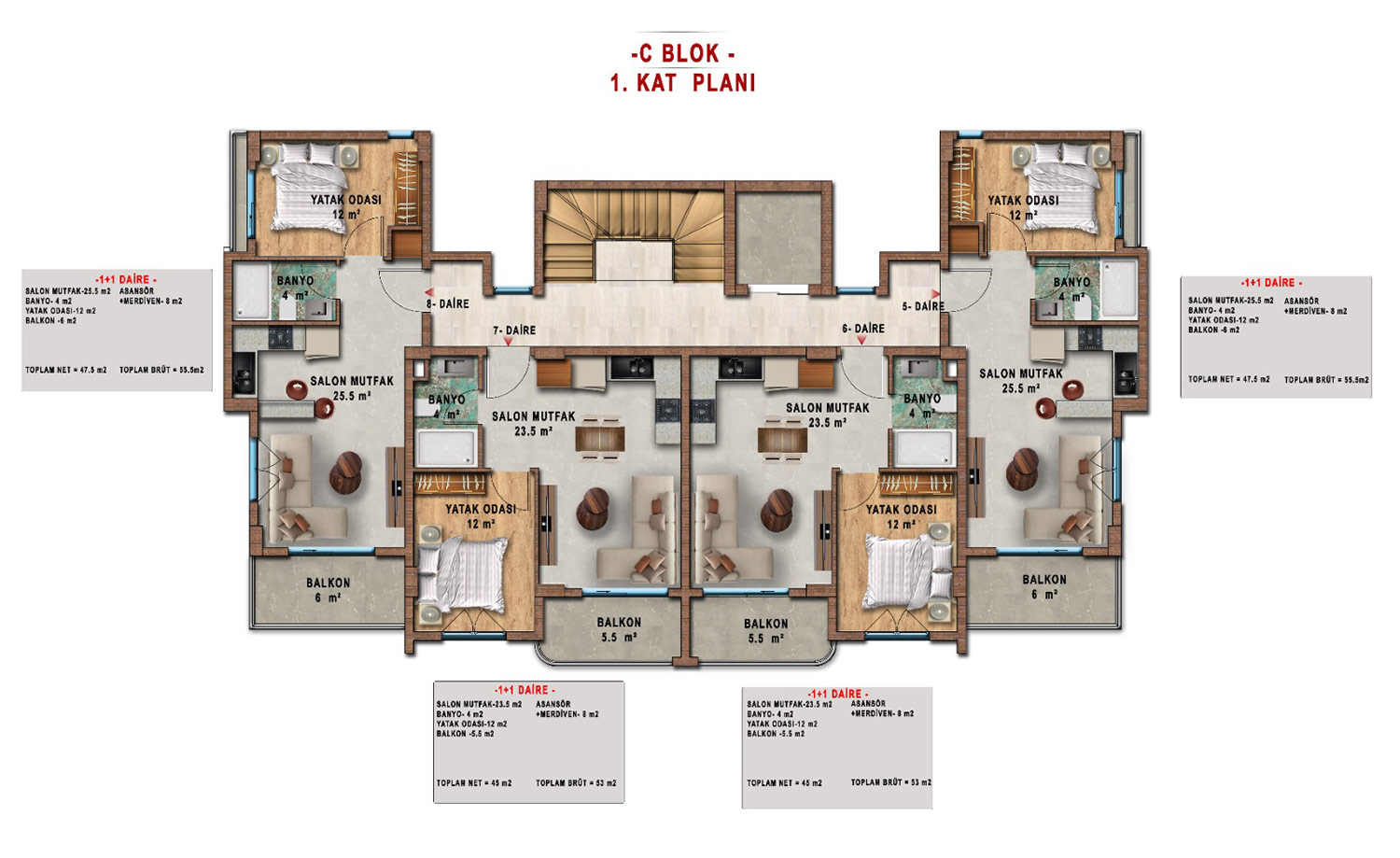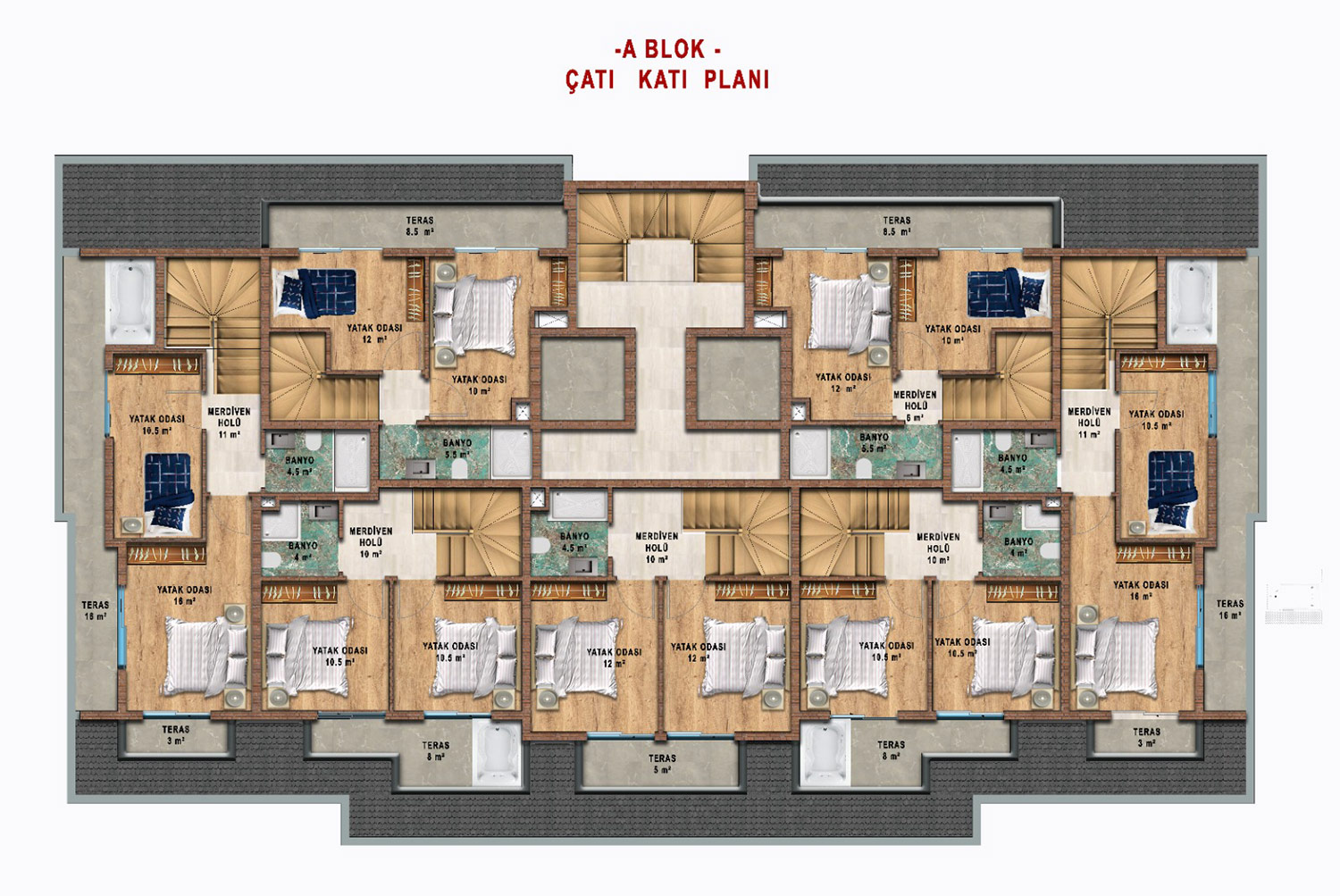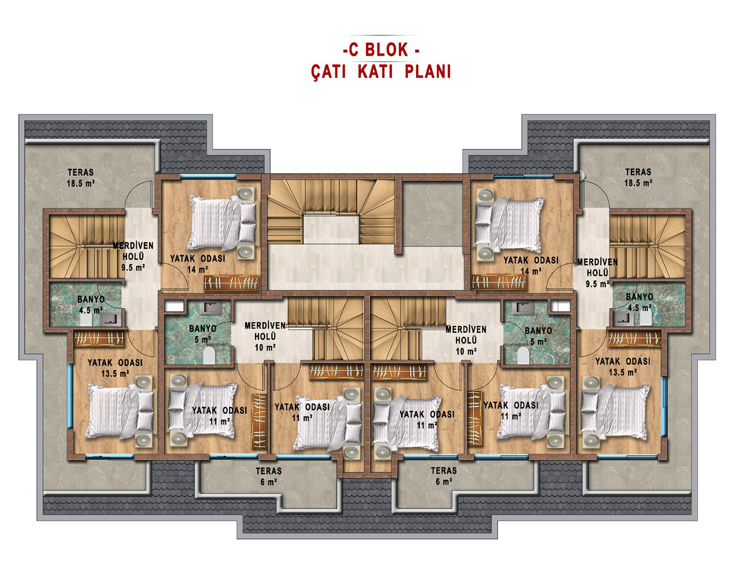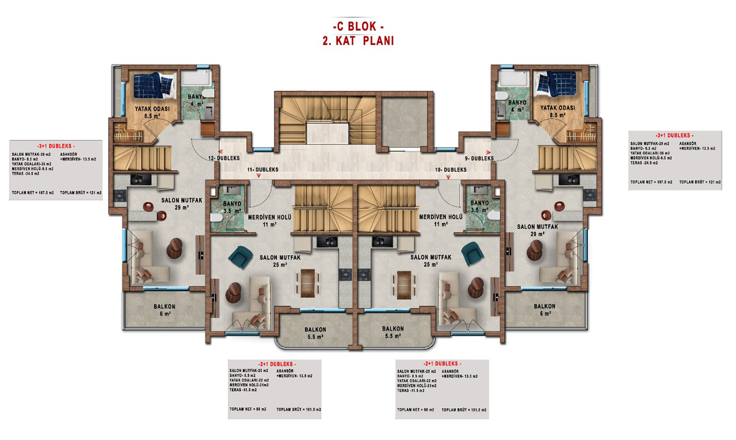 Types of flats in our project; 1+1, 2+1, 3+1 garden and roof duplexes, 2+1 garden and roof duplexes.