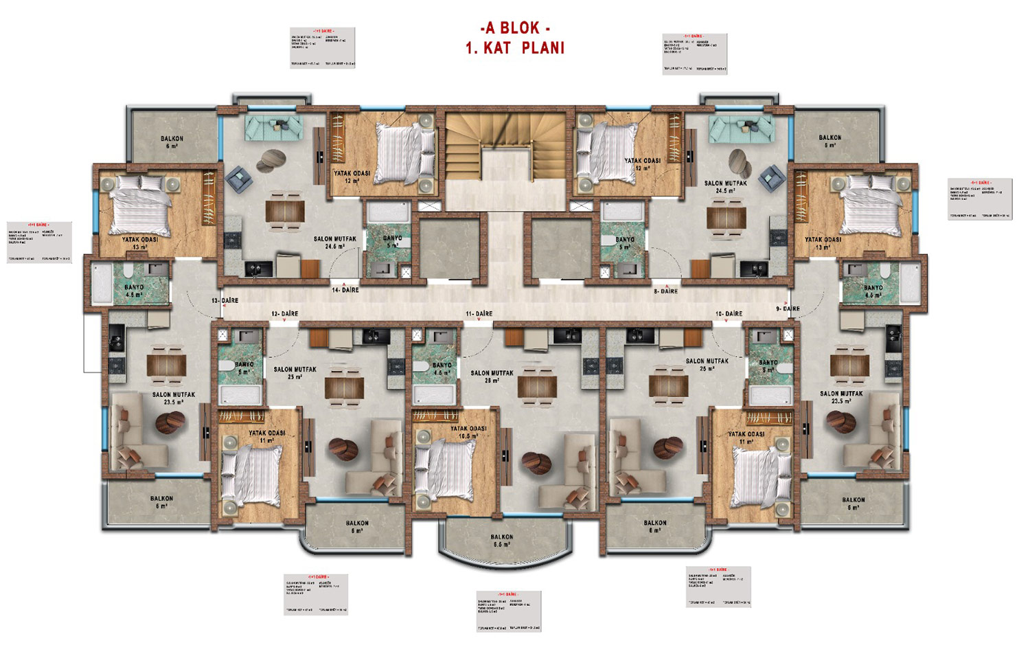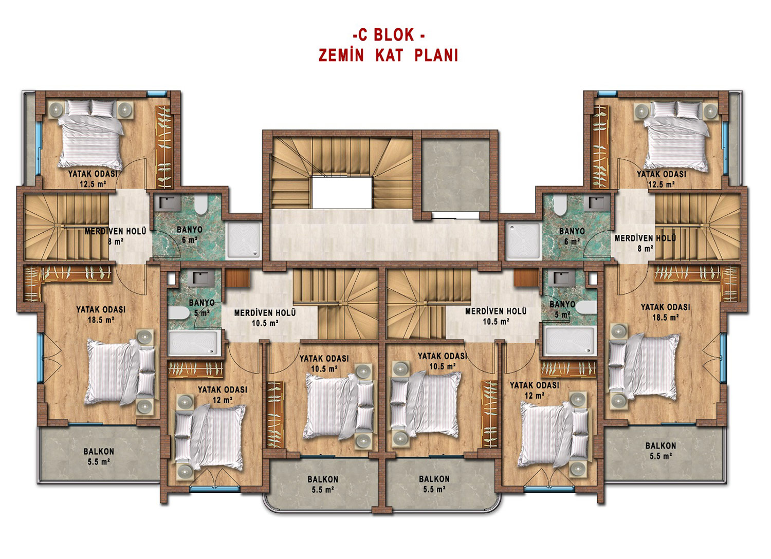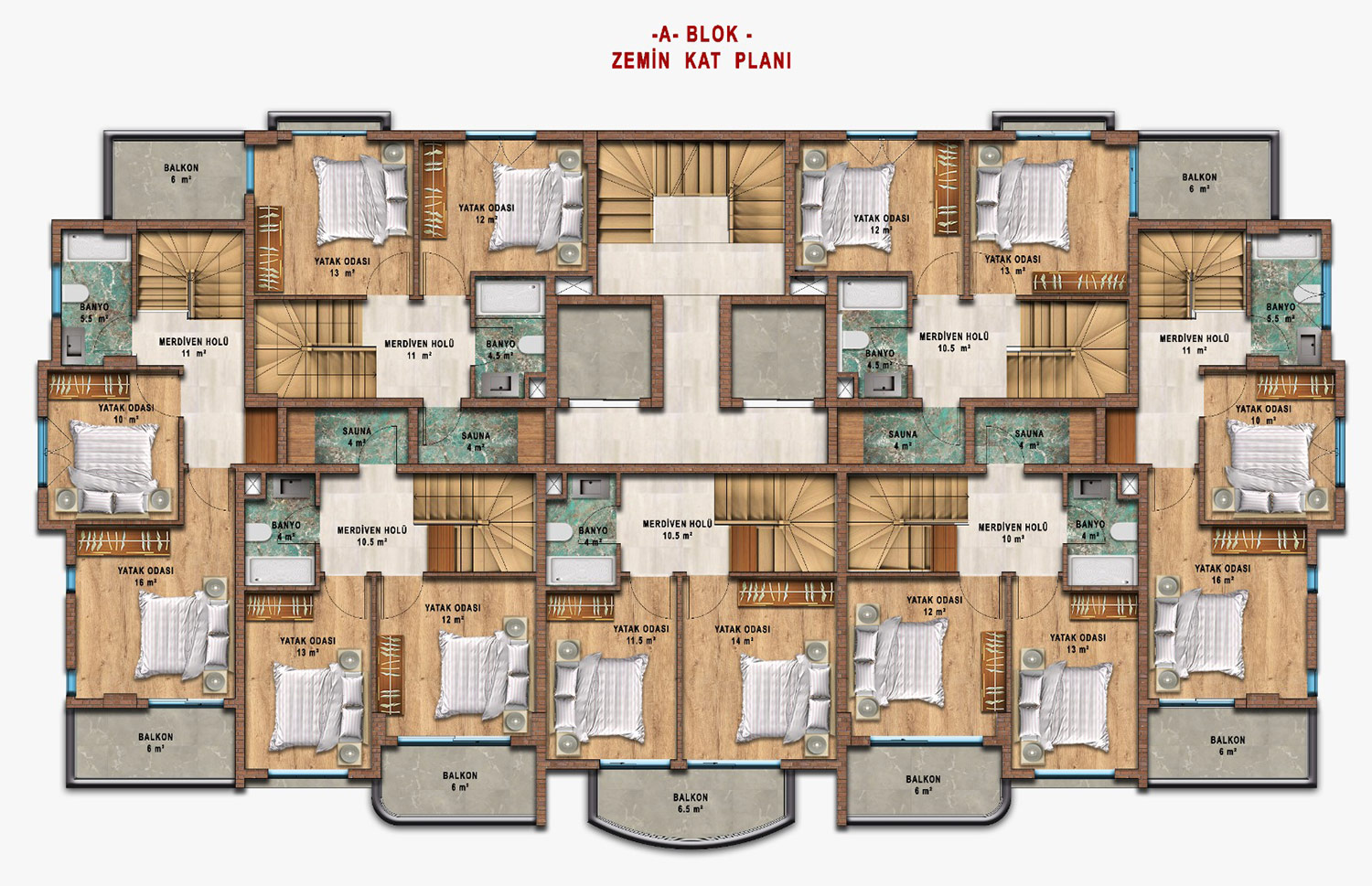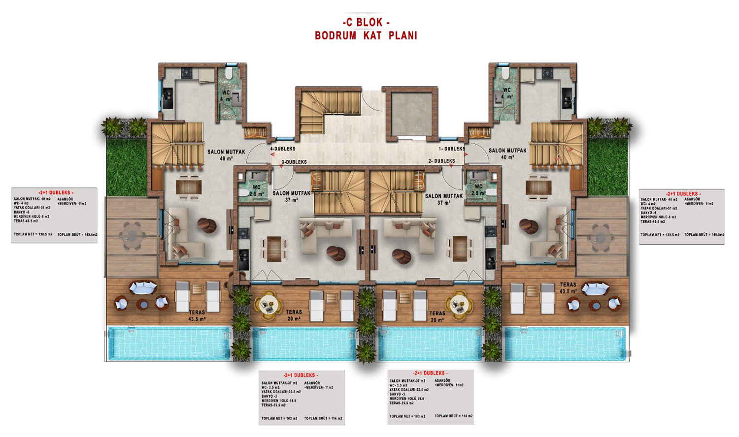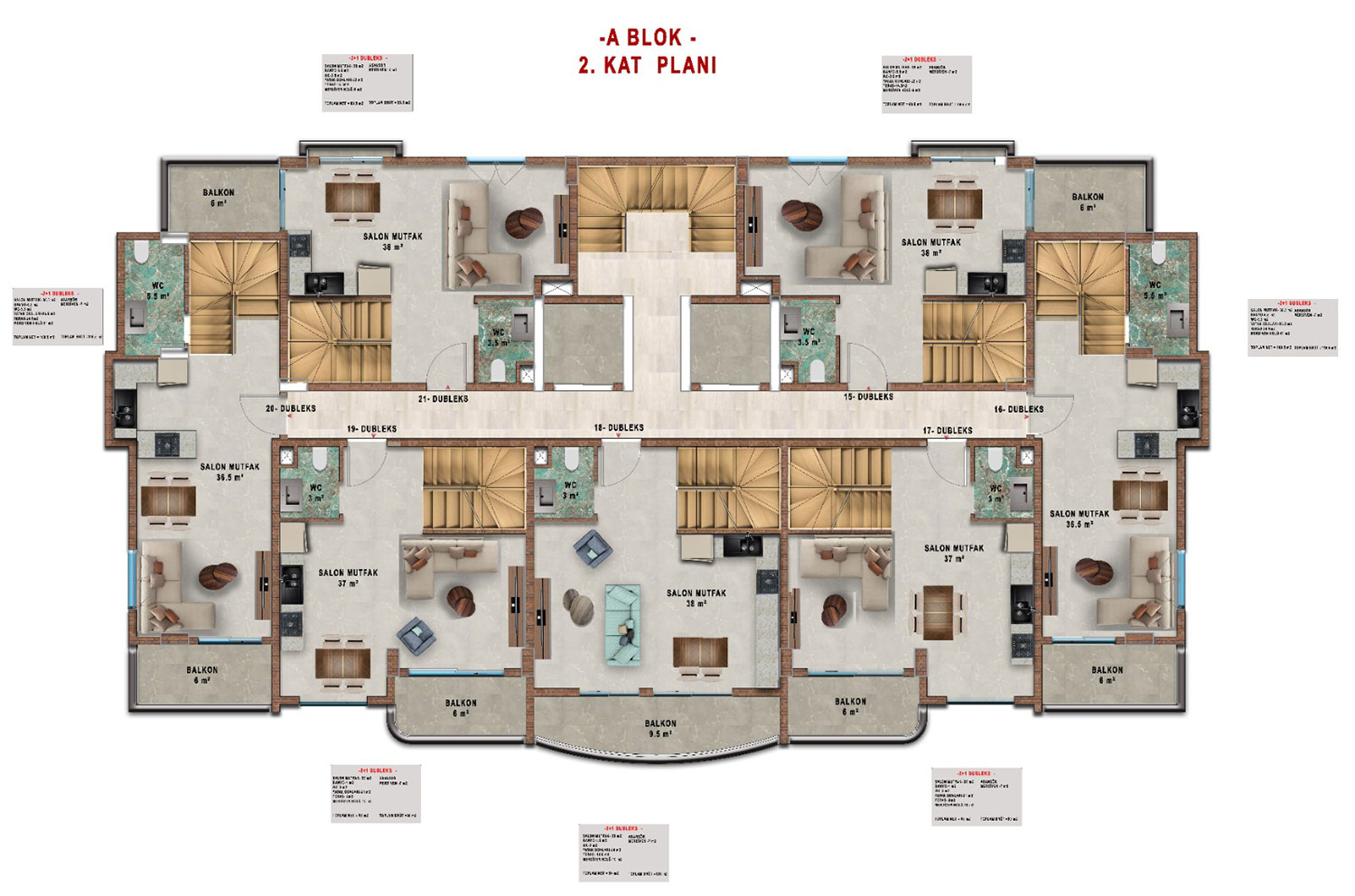 Types of flats in our project; 1+1, 2+1, 3+1 garden and roof duplexes, 2+1 garden and roof duplexes.