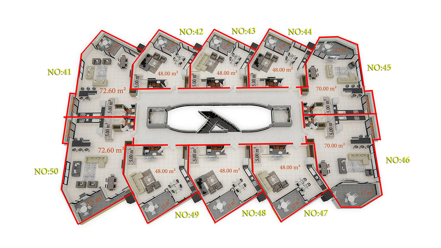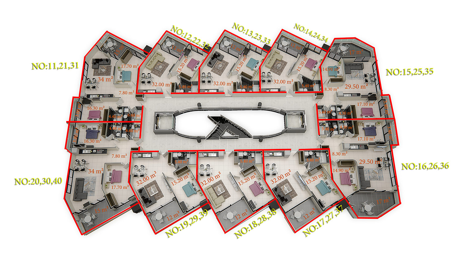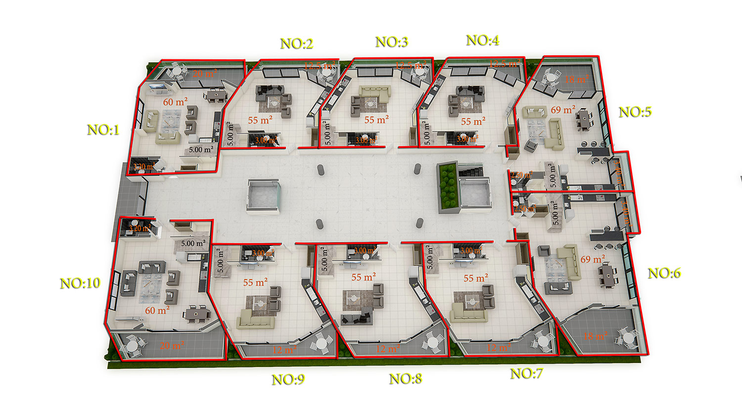 In apartments: steel doors, an on-door speakerphone with a video system. False ceilings and pointed hidden lighting. Washable paint on walls and floors from first class the granite. Porcelains, ceramics and developed by designer kitchens and bathrooms. Conditioners in all rooms, a home telephone number and double glass İtalian PVC windows and doors on balcony with noise isolation. The complex is located on the first coastline of the Mediterr0anean sea.