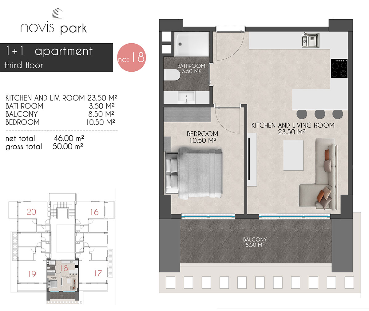 A nest of joy only 150 meters from shopping center and 50 meters from various cafes and restaurants promising world cuisines and cosmopolitan atmosphere. You can also find large shopping centers only within a diameter of 2.5 km. The newest park of the region is located right next to the development.