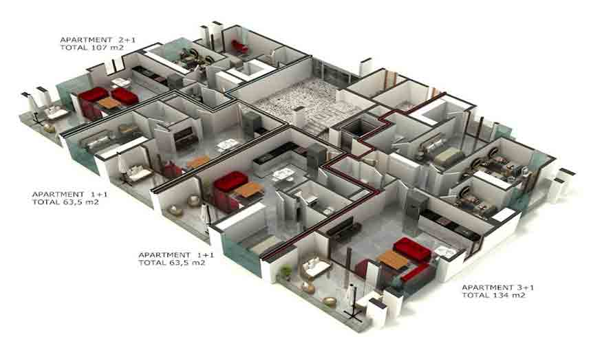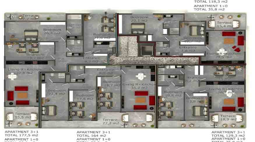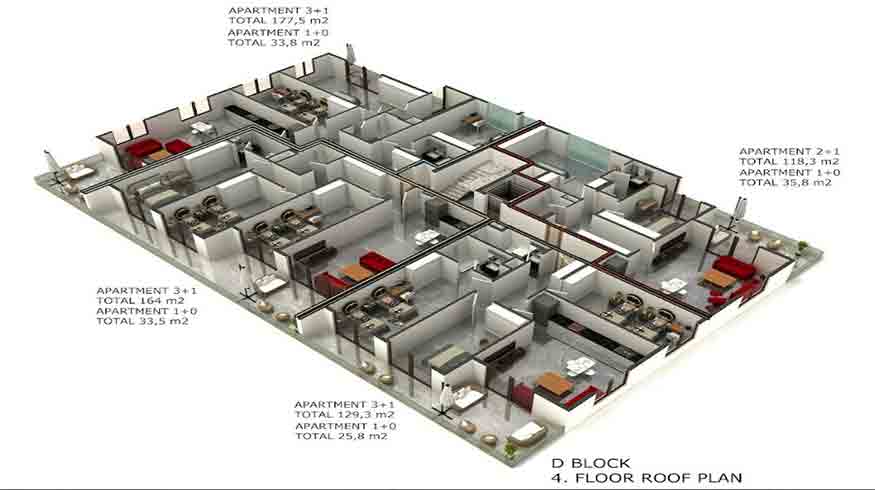 ● 3+1 American Kitchen 164 m2 and 1+0 Studio Flat 34 m2 is + 198 m2